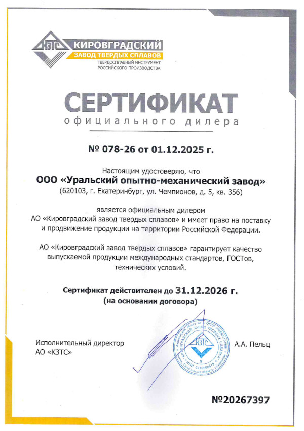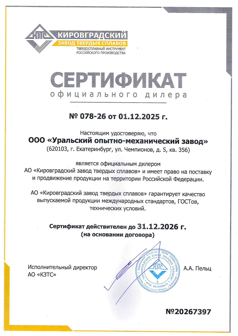 Вот уже более 8 лет "Уральский опытно-механический завод" является официальным дилером АО "Кировградский завод твердых сплавов". За время партнерской работы совместно были освоены новые формы твердосплавных пластин и современных мультислойных покрытий.